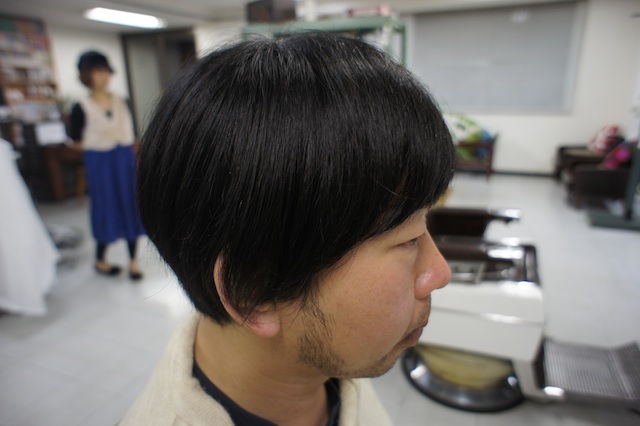 いつもは、みょうにまとまろうとする生えかたをしているので、できるだけイレギュラーなカットを心がけております。しかし今回は、真逆のスタイル。ツヤ感を主張させた清潔感あふれるスタイルです。不潔から清潔への転換、うまくいくだろうか?という不安もほんの一瞬。Bさんも、Aさんと同じ奇妙なクセ毛を持つ方で、すごくなじみ良い仕上がりになりました。