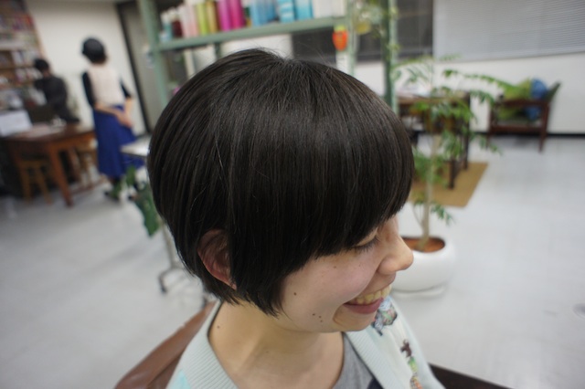 Aさんは、今回、久しぶりに前髪をつくりました。ボブベースの丸いシルエットにしていますが、お尻をグッと高い位置に設定しました。少しキリッと感を表現するためです。長くなってくると奇妙なクセ毛が発生してくるのですが、ここまでショートにすると逆におさまりが良いです。