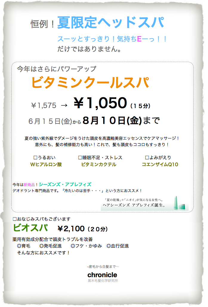 ●恒例!夏のクールスパ祭り! 投稿日2012年6月7日2020年1月31日投稿者chronicle ここだけの話し 裏メニューで トリートメント+ヘッドスパの「スパメント祭り」も 同時開催!☞http://chronicle1.petit.cc/banana/20120607195801.html