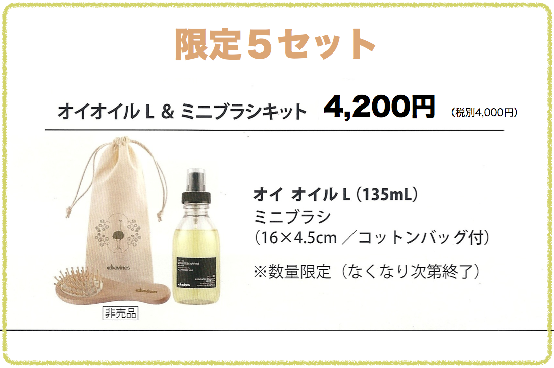 ●発売限定商品。 投稿日2013年4月24日2020年1月31日投稿者chronicle 4月から発売しているオーガニック商品「ダヴィネス」。 今回、新しくトリートメントオイルが仲間入り! それを記念して とってもかわいい!バックにすっぽり!なミニブラシが付いてくる! 限定5セット! オイルの実力は来店の際にお試しを!