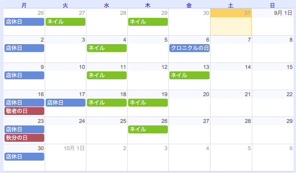 ●「9月の店休日」と「ネイル可能日」です。 投稿日2013年8月31日2020年1月31日投稿者chronicle 「ネイル可能日」以外でも18時からのご予約承ります! *但し、9月6日は除きます。 予告!! 10月と11月は「ネイル強化月間」を予定してます! お知らせお楽しみに。