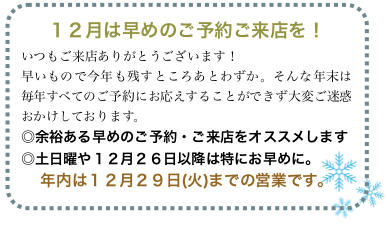 ◎1月のおしらせ 投稿日2016年1月9日2020年1月31日 ぼーっとしていたら9日も過ぎてました! 今年もよろしくお願いいたします。 今月、12日火曜日から 恒例の「福引き祭り」が始まります! どうぞ、皆さんお楽しみに! そして 誠に勝手ながら 28日木曜日はビルの工事で 騒音と振動がヒド過ぎるために 営業を休ませていただきます。 ご迷惑おかけいたします。