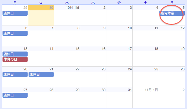 ◉10月のおしらせ。&11月も。 投稿日2014年9月30日2020年1月31日 さて、10月です。 秋らしいような、夏らしいような。 そんな季節です。 突然ですが、 10月5日(日)は臨時休業とさせていただきます。 ※秋の社内体力づくりの日の為です。 11月は4日(火)と11日(火)は 秋のスキルアップ合宿のため臨時休業とさせていただきます。 今後の技術サービス向上のため みなさまにはご迷惑をおかけいたしますが どうぞよろしくお願いいたします。