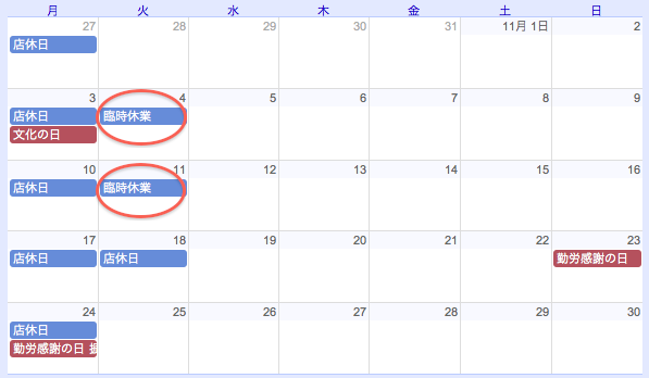 ◉「11月のおしらせ」の訂正とお詫び。 投稿日2014年10月21日2020年1月31日 大変申し訳ありません! 先日の「11月のおしらせ」について訂正があります! 11月11日(火)は臨時休業とおしらせしたのですが 通常営業の誤りでした。 お騒がせいたしました。